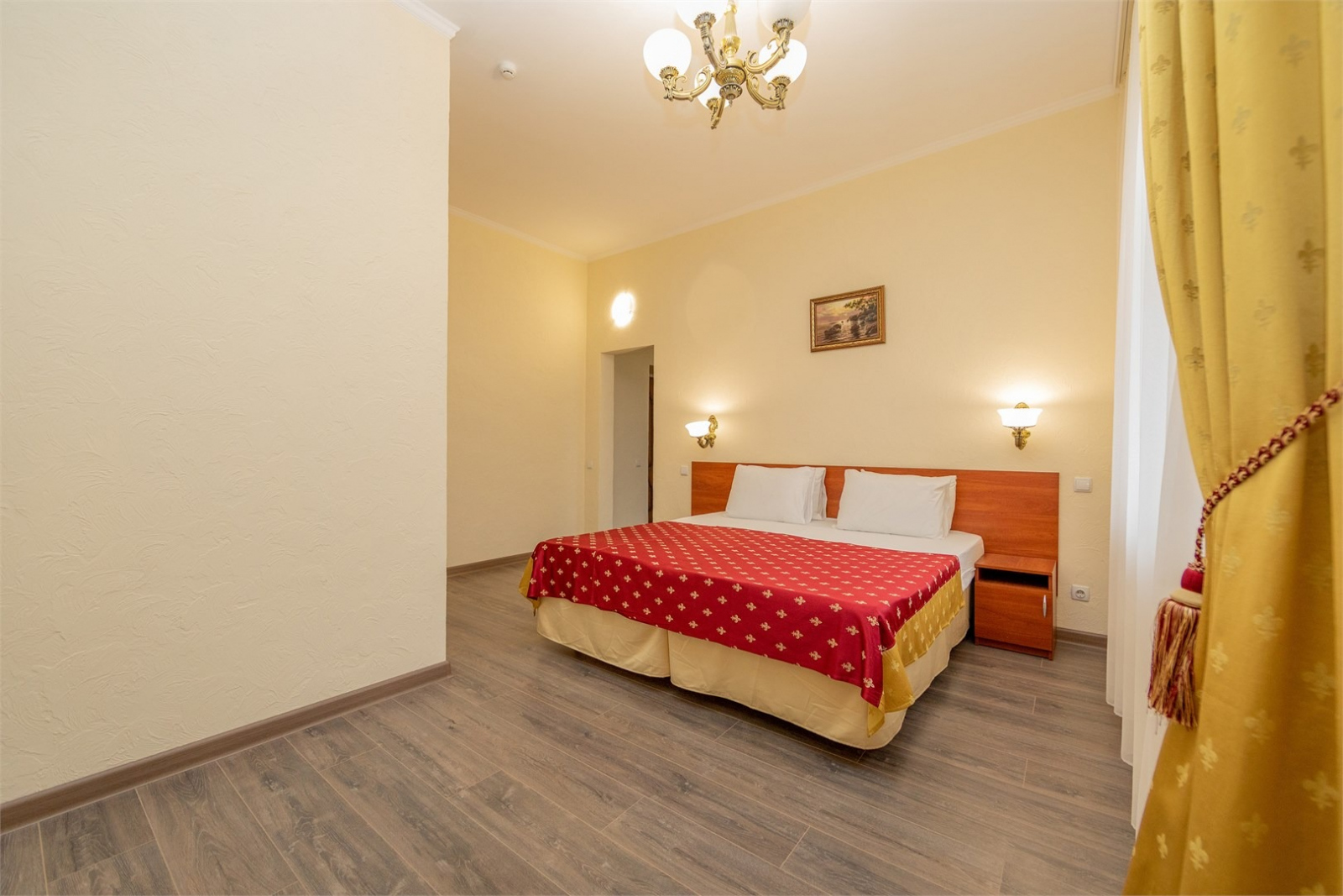 Двухкомнатный номер с современным ремонтом без проходной двери. Общая площадь 30-35 м2. В номере есть Wi-Fi, кондиционер, холодильник, телевизор, фен, сейф и необходимая мебель: одёжный шкаф, две односпальные кровати с возможностью объединения, журнальный столик, прикроватные тумбочки. Во второй комнате имеется кресло-кровать, которое используется как дополнительное спальное место. При размещении с маленькими детьми, бесплатно предоставляется детская кроватка. При размещении четвертого взрослого гостя устанавливается евро раскладушка.